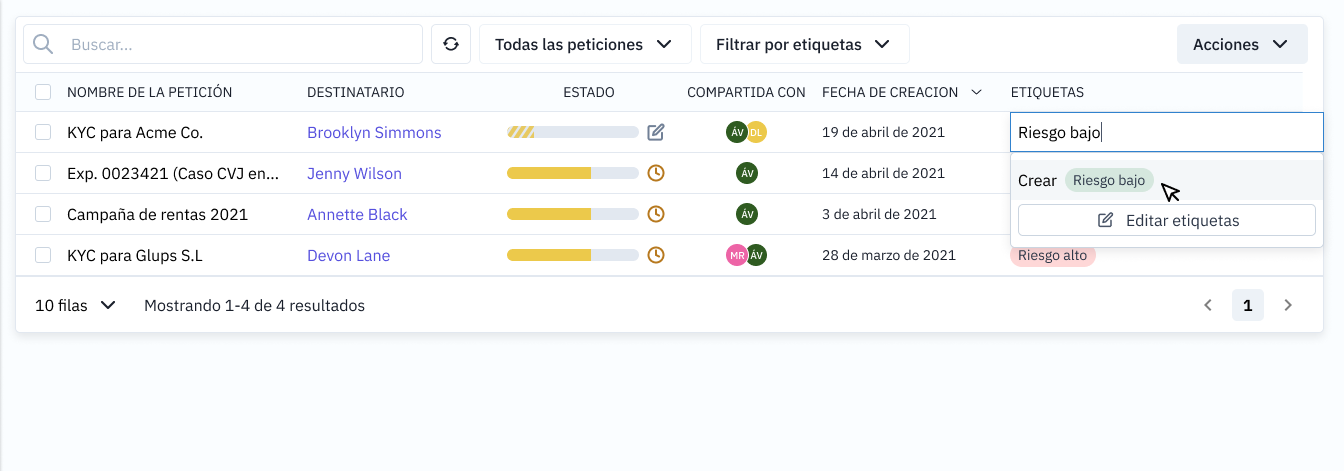 - Puedes crear o reutilizar una etiqueta ya existente en tu organización y asignarla a una petición creada.