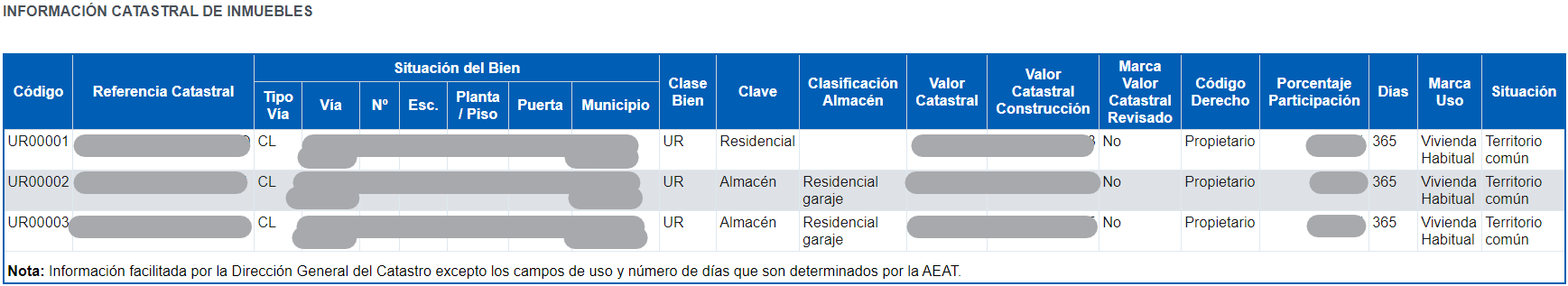 Es importante revisar bien este apartado, pues podremos detectar cómo está declarado en el catastro (de ahí proceden los datos), y ver qué inmuebles tiene en España. Esto nos permitirá tener una idea de los alquileres que pueda tener, o las imputaciones de renta que hay que calcular.